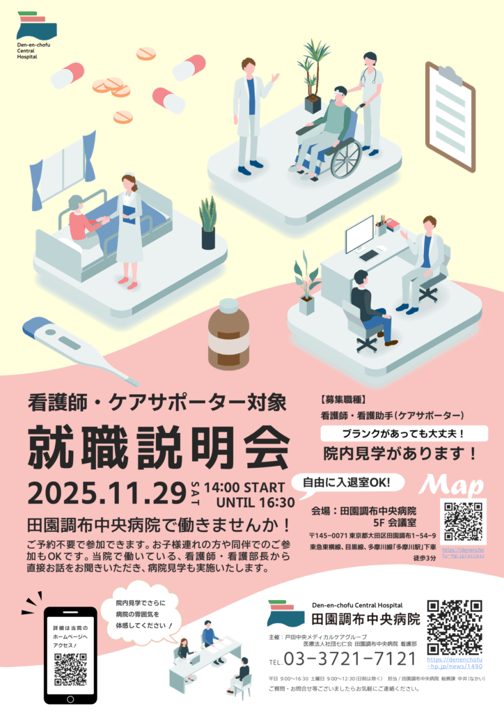 このたび、看護師・ケアサポーターを対象とした田園調布中央病院の就職説明会を開催いたします。
