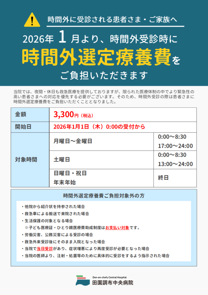 時間外(夜間・休日)選定療養費のお知らせ(2026年1月1日より)